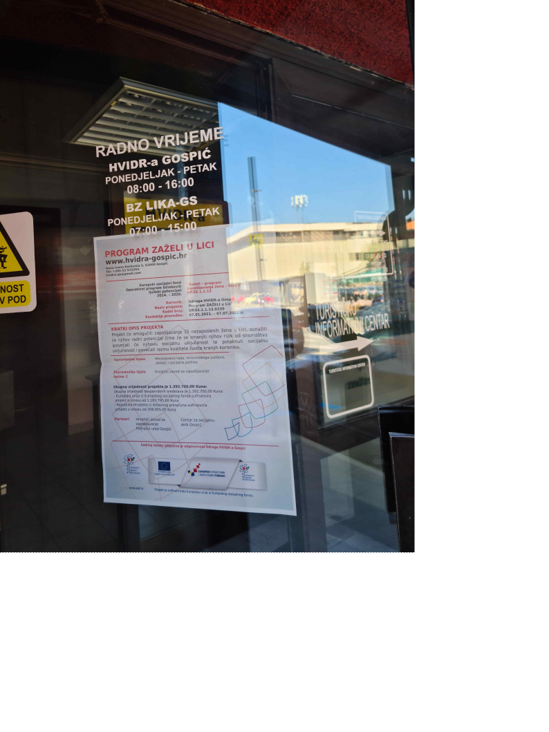Na ulaznim vratima Udruge HVIDR-a Gospić tijekom trajanja projekta bio je dostupan plakat veličine A3 koji je informirao javnosti o Provedbi Programa Zaželi u Lici. Na plakatu projekta vidljivi su osnovni i najznačajniji podaci o provedbi Programa.